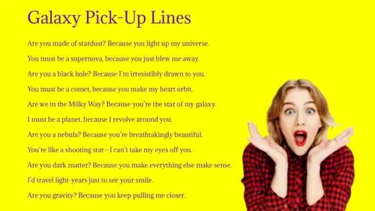 Galaxy pickup lines are space-themed flirting jokes designed to make someone smile while sending them into orbit. They combine celestial imagery, romantic wordplay, and playful humor to create charming conversation starters. From clever references to planets and stars to cosmic compliments, these lines are perfect for anyone who loves space, humor, and lighthearted fun.